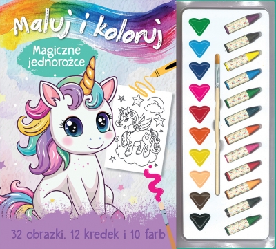 Ta kolorowanka to właściwie zestaw plastyczny: poza planszami z jednorożcami do pokolorowania zawiera także kredki, farby i pędzelek. Dziecko może zatem kolorować swoją ulubioną techniką, albo też zmieniać malowanie na rysowanie i odwrotnie, wreszcie posługiwać się techniką mieszaną.